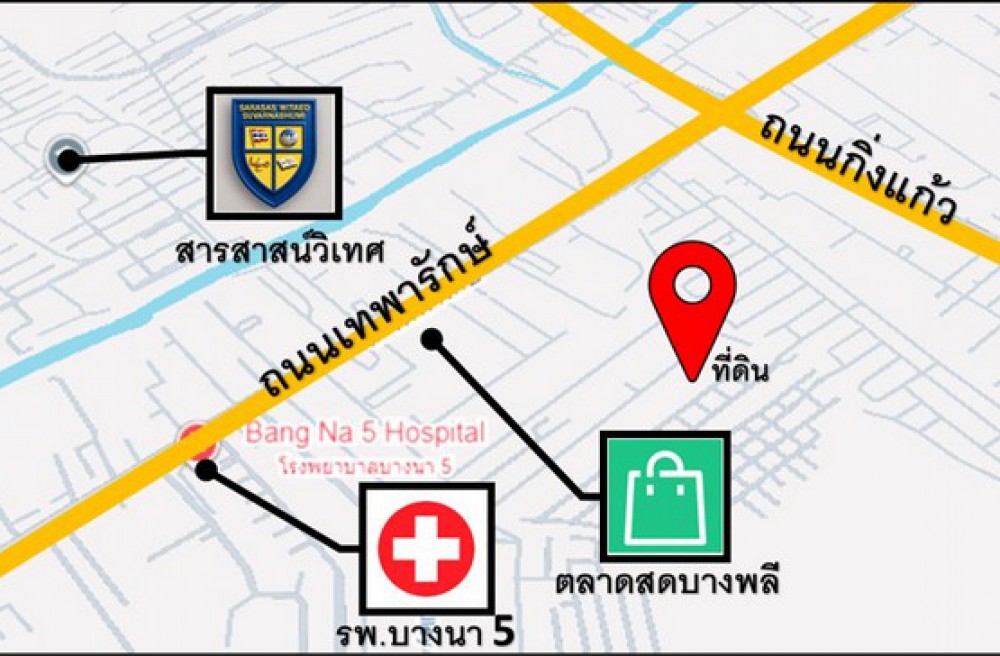 - ใกล้ รร.สารสาสน์วิเทศสุวรรณภูมิ, รพ.บางนา 5, ตลาดสดบางพลี
