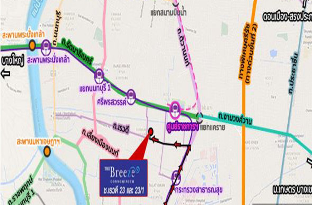 การเดินทาง เริ่มจาก แยกติวานนท์ ⇒ ถนนติวานนท์ ⇒ ถนนเรวดี ⇒ ซอยเรวดี34 ตรงไปอีก 50 เมตรถึงโครงการ The Breeze Condo เรวดี23/1