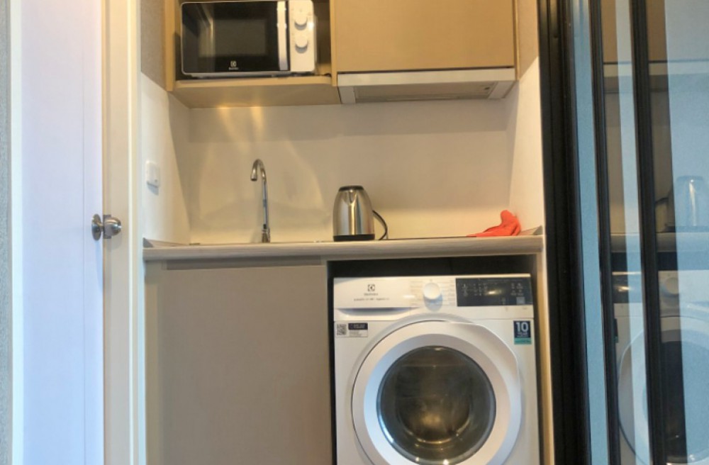 ตำแหน่งชุดครัวอยู่ ระหว่างห้องน้ำกับห้องอเนกประสงค์ เดินใช้งานสะดวก