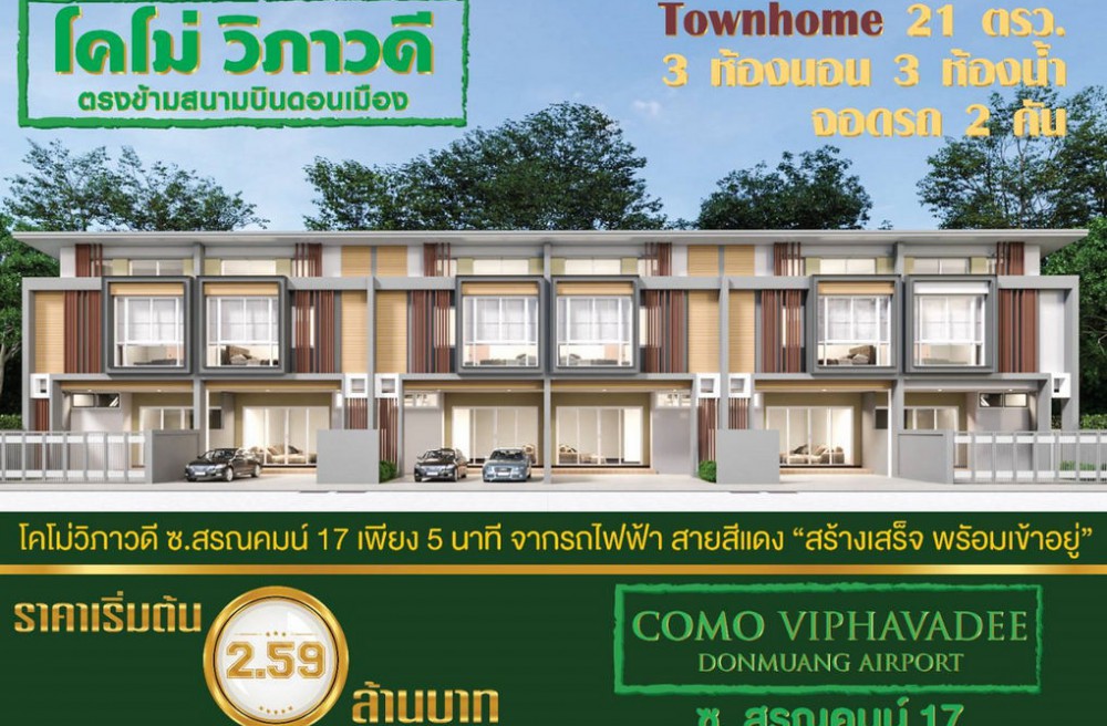 เขตดอนเมือง , จังหวัดกรุงเทพมหานครโครงการ โคโม่ วิภาวดี ทาวน์โฮมสร้างใหม่ 94/34 หน้ากว้าง 5.8 เมตร เนื้อที่ 21 ตารางวา 3 ห้องนอน 3 ห้องน้ำ 1 ห้องเก็บของ ตรงข้ามสนามบินดอนเมือง