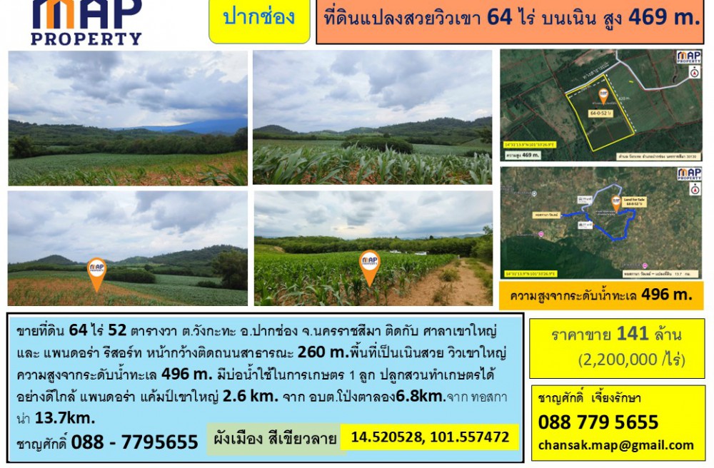 - พื้นที่เป็นเนินสวย วิวเขาใหญ่ความสูงจากระดับน้ำทะเล 496 m.