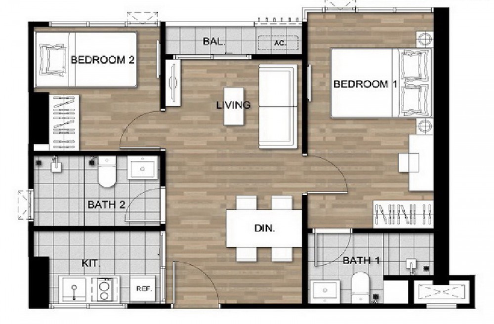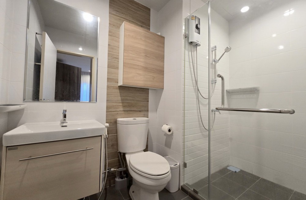 แบ่งสัดส่วนห้องนั่งเล่น ครัว และห้องนอนอย่างชัดเจน ครัวปิดมีกระจกกั้น ป้องกันกลิ่นอาหาร ห้องนั่งเล่นกว้างเชื่อมต่อระเบียง ใช้เป็นมุมพักผ่อน รับแขก หรือพื้นที่ทำงานได้สบาย ห้องนอนหลักมีห้องน้ำในตัว อีกห้องนอน ยังสามารถปรับเปลี่ยนได้ตามความต้องการ เช่นห้องทำงาน ห้องดูหนัง ห้องเล่นเกมส์ ห้องเก็บของได้ สำหรับห้องน้ำทั้ง 2 ห้องแยกโซนเปียก–แห้งเป็นที่เรียบร้อย ใช้งานสะดวก และง่ายต่อการทำความสะอาด