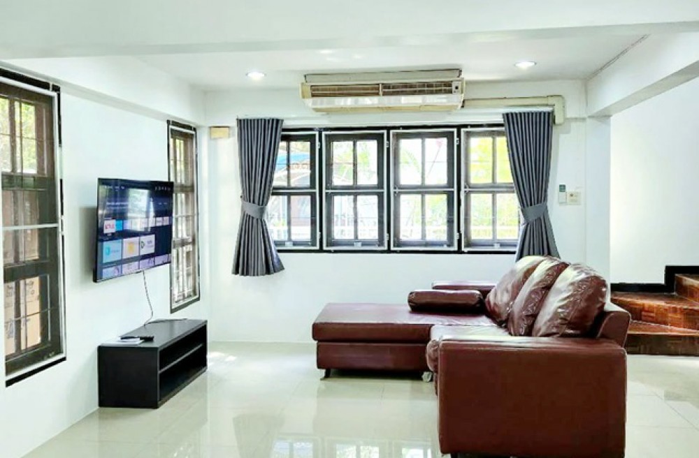 Corner house for rent in a prime location, Ramkhamhaeng 110-112, near MRT Sammakorn (200 meters). The house is a spacious 2-story unit with full furnishings, featuring 2-3 bedrooms and 3 bathrooms. Ready to move in. 26,999 THB/month. (Near Ban Ma intersection, 2.3 km from Ramkhamhaeng Road)