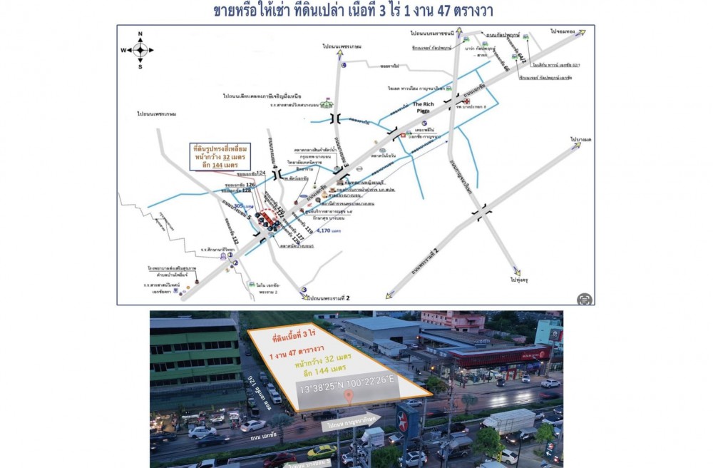 ใกล้แยกบางบอน 5 เนื้อที่ 3 ไร่ 1 งาน 47 ตารางวา ที่ดินรูปสี่เหลี่ยม