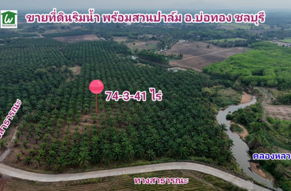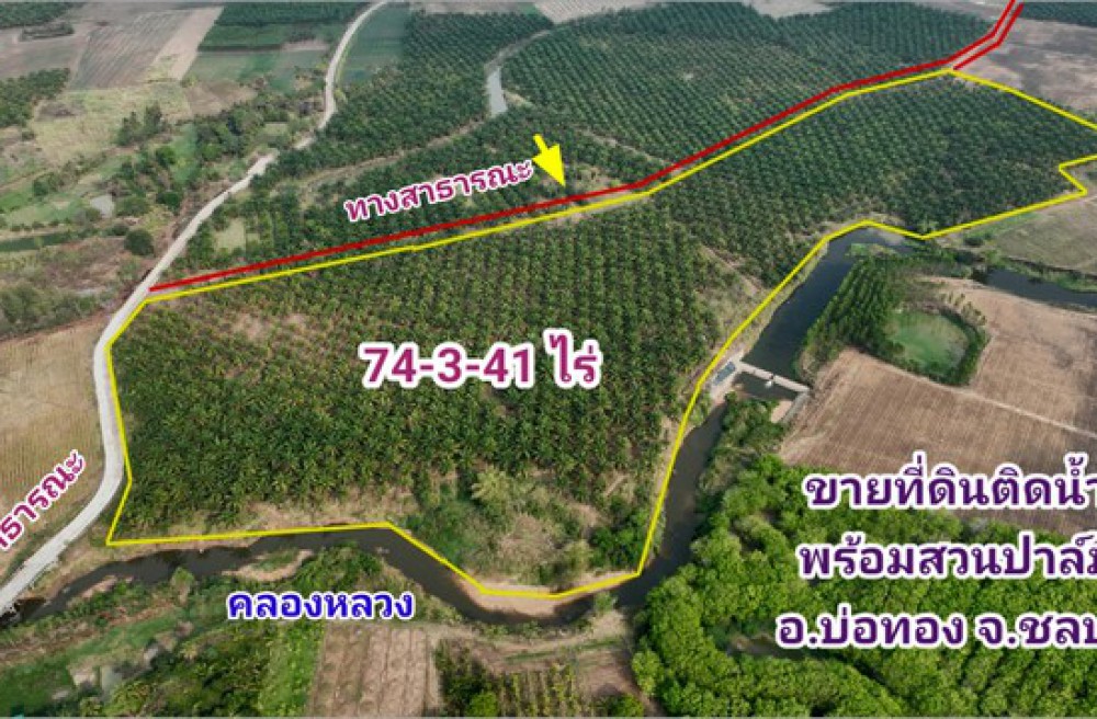 บ่อทอง , จังหวัดชลบุรีขายที่ดินติดน้ำ อำเภอบ่อทอง ชลบุรี 74-3-41 ไร่ ขายที่ดินพร้อมสวนปาล์ม บ่อทอง ชลบุรี ขายที่ดินริมน้ำ บ่อทอง ชลบุรี มีน้ำใช้เพื่อการเกษตรตลอดปี ราคาไร่ละ 790,000บาท ปาล์มอายุ10ปีเก็บผลิตได้ ขายที่ดินติดน้ำบ่อทองชลบุรี