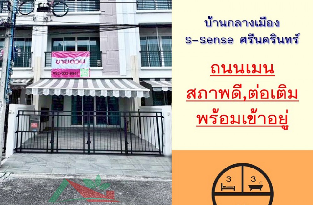 เขตประเวศ , จังหวัดกรุงเทพมหานครขายทาวน์โฮม3ชั้น 20ตรว. ถนนเมน ม.บ้านกลางเมือง S-Sense ศรีนครินทร์ สวยต่อเติมพร้อมอยู่