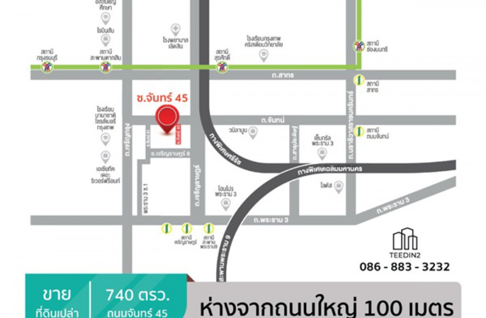 740 ตารางวา | ห่างถนนจันทน์เพียง 100 เมตร ท้ายซอยทะลุออกถนนเจริญราษฎร์ได้ทันที