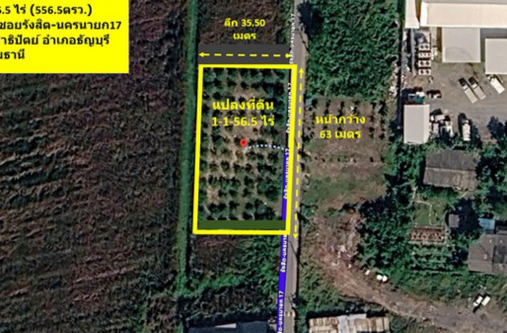 ธัญบุรี , จังหวัดปทุมธานีขายถูกที่ดินถมสูงกว่าถนน ธัญบุรี คลอง1 มีศักยภาพสูง แปลงที่ดินล้อมคอนกรีตหนาอย่างดี 4 ด้าน 1-1-57(557 ตารางวา ไร่ อยู่ในซอยรังสิต-นครนายก 17 เข้าซอยประมาณ 400 ม. ติดถนนซอยคอนกรีต 6 เมตร การคมนาคมสะดวก ใกล้ถนนใหญ่รังสิต-นครนายก ใกล้รถไฟฟ้าสายสีแดง สถานีรังสิต เพียง ใกล้สนามบินดอนเมือง ใกล้ดอนเมืองโทลล์เวย์ ที่ดินแปลงนี้อยู่แหล่งชุมชนที่มีการขยายตัวอย่างต่อเนื่อง ทำเลย่านธุรกิจที่มีความเจริญ สาธารณูปโภคไฟฟ้า น้ำประปาพร้อม
