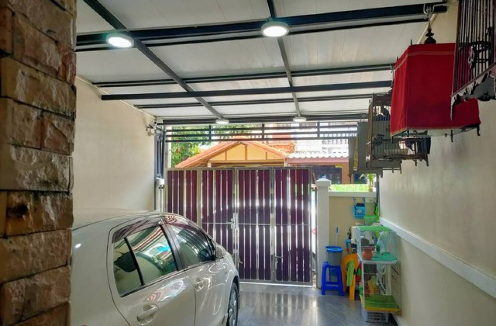 ลักษณะบ้าน : ทาวน์เฮ้าส์ 2 ชั้น มีระเบียง ต่อเติมห้องครัวด้านหลัง ติดตั้งมุ้งลวด