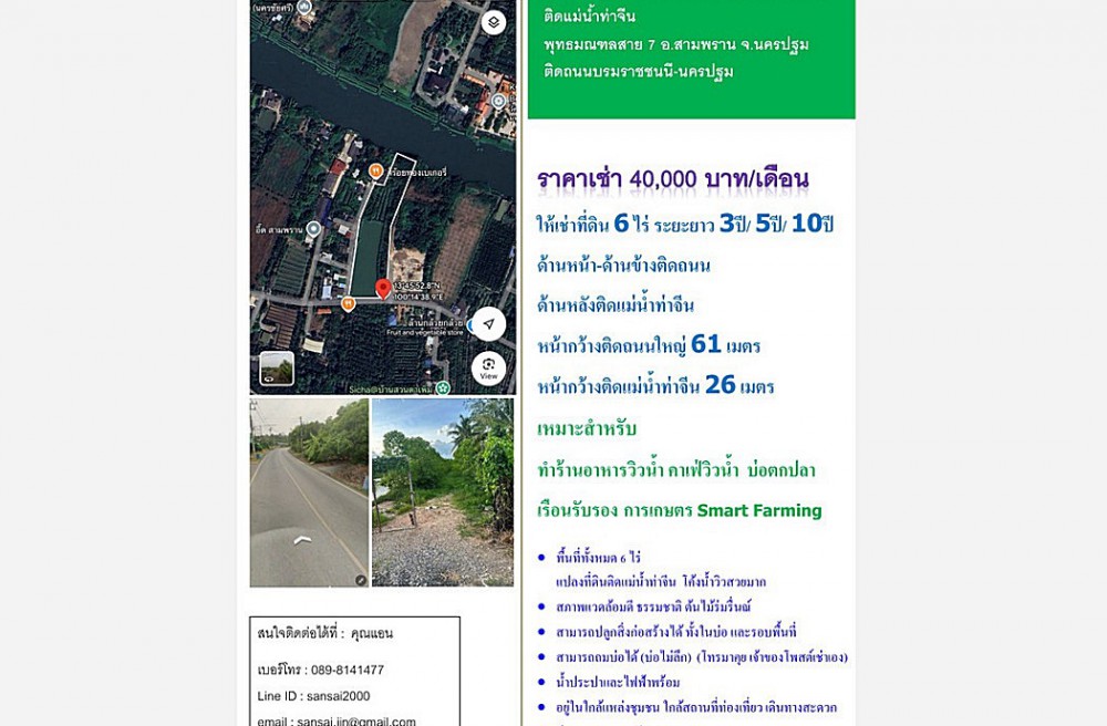 สามพราน , จังหวัดนครปฐมให้เช่าที่ดินศาลายา 6 ไร่ ติดแม่น้ำท่าจีน ถนนบรมราชชนนี-สาย 7 สามพราน นครปฐม ใกล้เซ็นทรัลศาลายา ใกล้มหาวิทยาลัยมหิดล