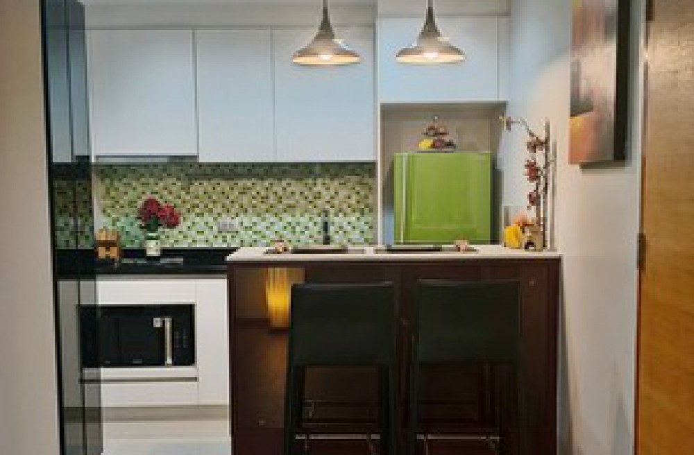 Kitchen: I-Shape built-in counter with a high-quality Marble Top, including a cooking zone and dining counter.