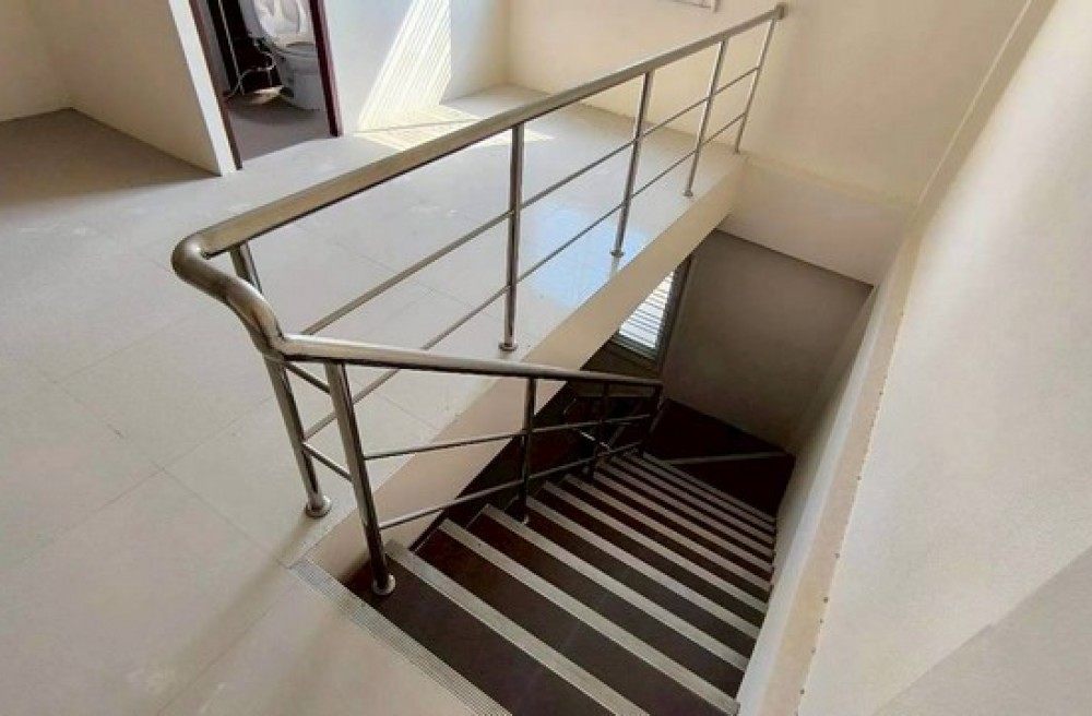 บันไดปูพื้นกระเบื้อง ราวบันไดเป็นราวสแตนเลสทุกชั้น