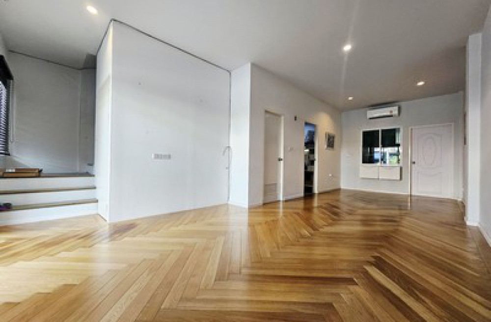 - ปูพื้นไม้จริงทั้งหลัง (ลายก้างปลา) ให้สัมผัสที่นุ่มนวล หรูหรา และแตกต่างจากบ้านทั่วไปอย่างชัดเจน