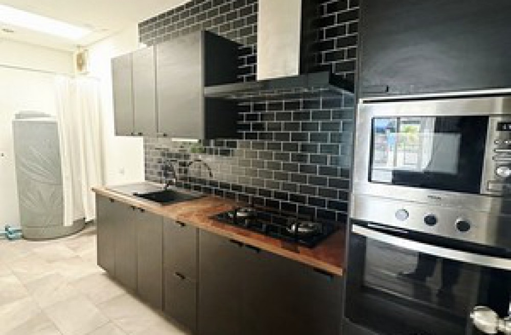 - ต่อเติมครัวบิ้วอินครบชุด ตกแต่งสไตล์ Modern Loft โทนสีดำสุดเท่ พร้อมเคาน์เตอร์ท็อปไม้ เตาแก๊ส และเครื่องดูดควัน พร้อมใช้งานทันที
