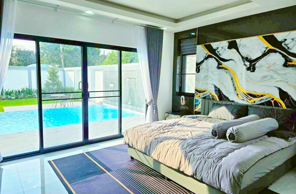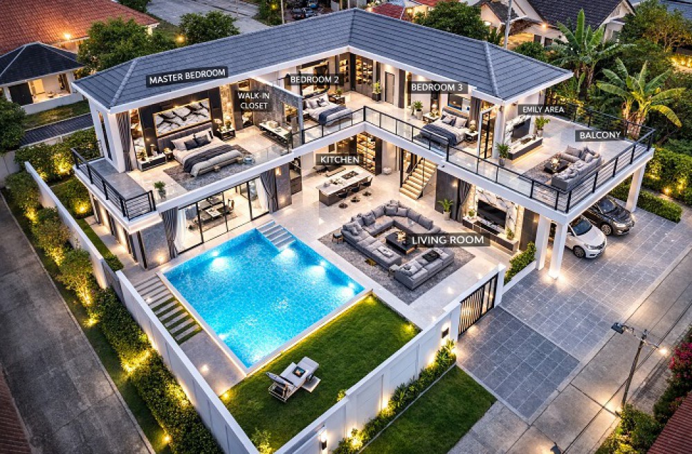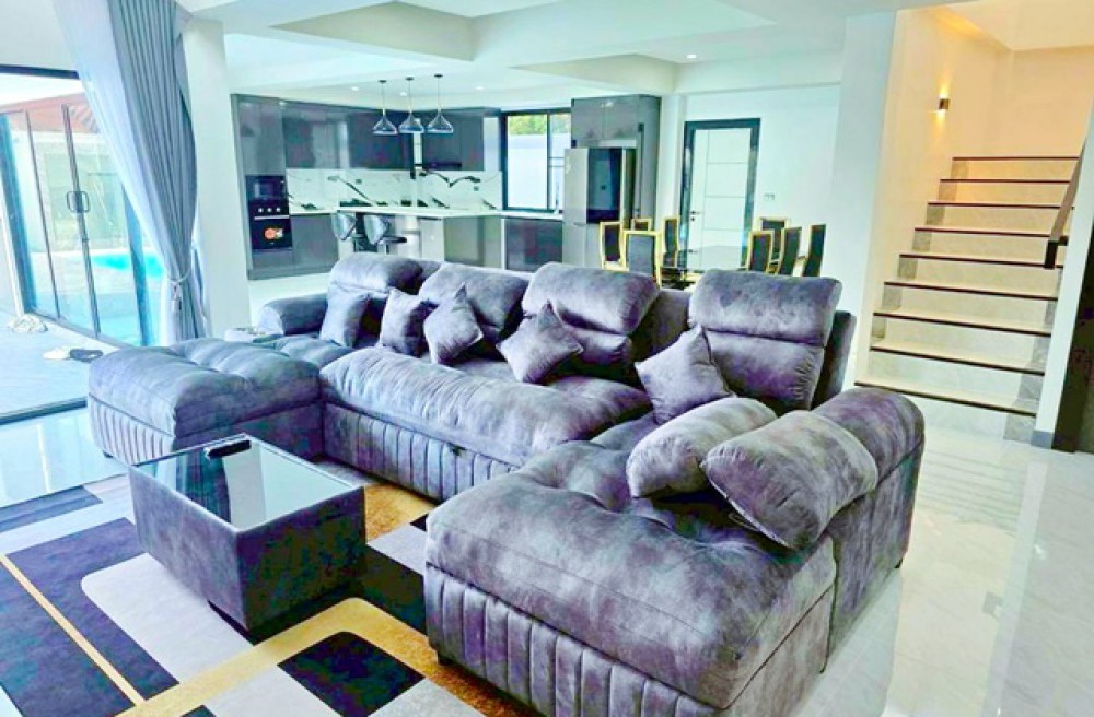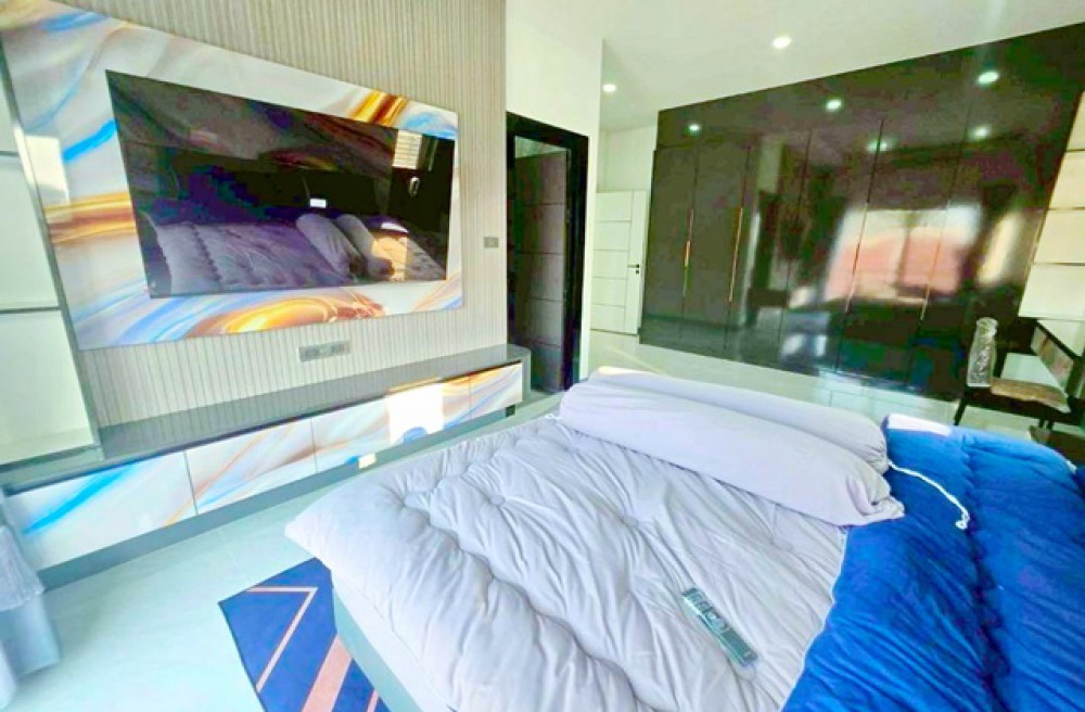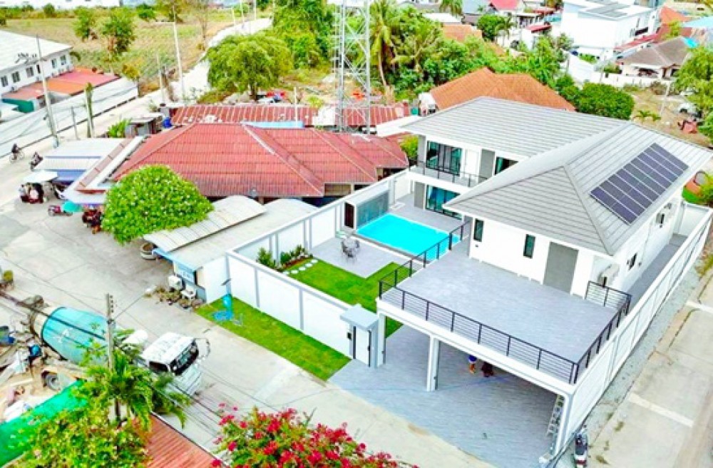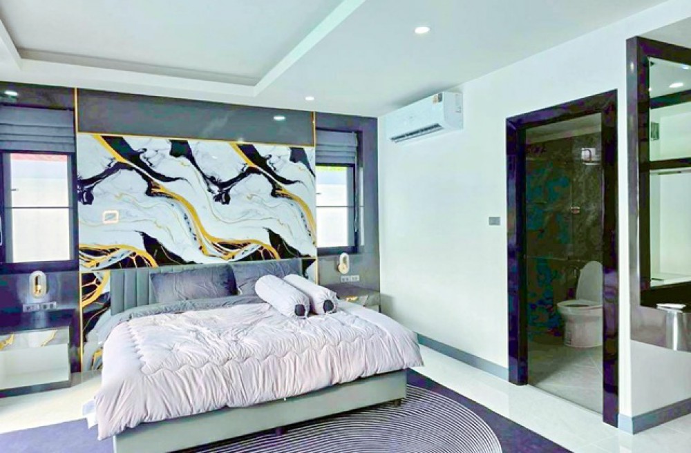 from Nong Prue Market land size 130 sq.wa.private pool Villa 5 bed Phra Praphanimit 5-11 Luxury house with 6 bath 700 m. usable area 450 sq.m. rent 149,998 B-M. brand new fully furnished house suitable for residence holiday home or rental business near Pattaya Dolphinarium 1.7 km. convenient access to Sukhumvit Road connecting Pattaya Central Pattaya South and tourist attractions