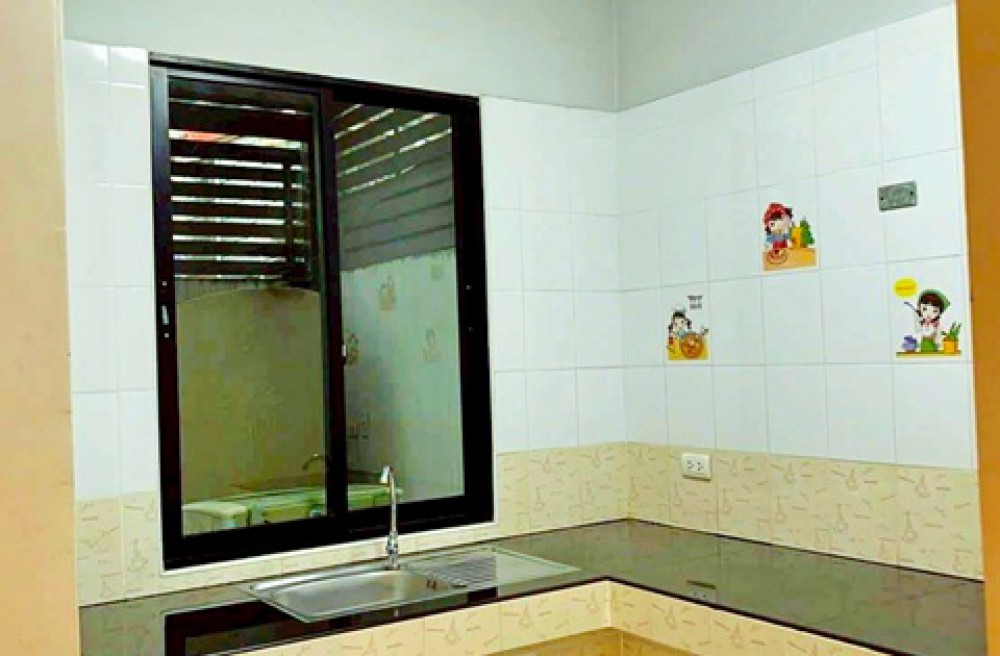 มีห้องครัวพร้อมชุดครัว เตาไฟฟ้า และไมโครเวฟ ต่อเติมพื้นที่หน้าบ้านและหลังบ้าน เพิ่มพื้นที่ใช้สอยสำหรับครอบครัว
