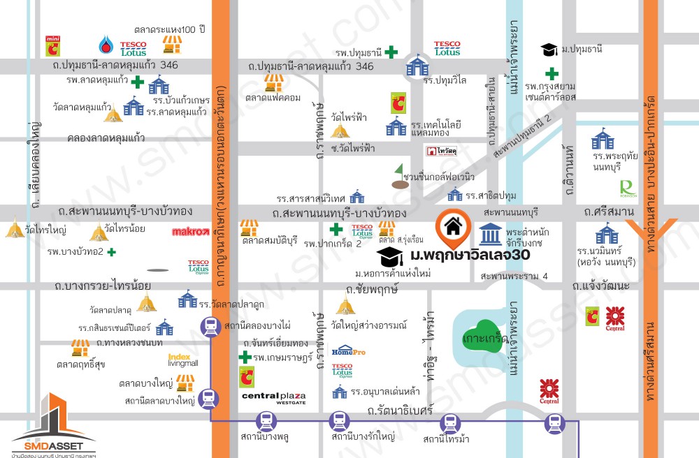 - ทำเลศักยภาพ ติดถนน 345 เชื่อมต่อชัยพฤกษ์ ราชพฤกษ์ และกรุงเทพ–ปทุมธานี ใกล้บิ๊กซี โลตัส โรบินสันไลฟ์สไตล์ ราชพฤกษ์ ไทวัสดุ เดอะไนน์ เซ็นเตอร์ ติวานนท์ โรงเรียนพระแม่มารีอุปถัมภ์ และโรงพยาบาลปทุมธานี