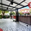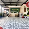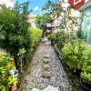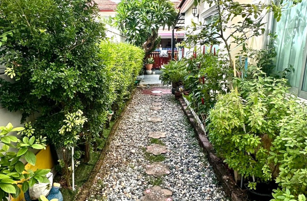 ลานจอดรถปูกระเบื้องใหม่สวยงาม พื้นที่ข้างบ้านตกแต่งเป็นสวนต้นไม้
