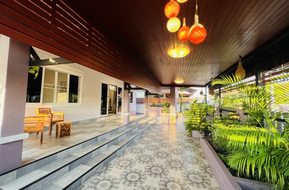 รอบบ้านตกแต่งสวนดอกไม้ พร้อมระแนงดอกพวงชมพูบานสะพรั่งข้างบ้าน ช่วยให้บ้านเย็น พร้อมเก้าอี้ไม้สักแท้ นั่งเล่นทานกาแฟ หน้าบ้าน