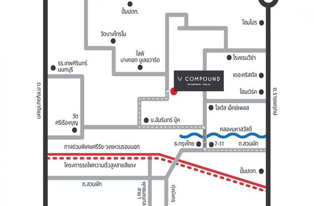 การเดินทาง เริ่มจาก ถ.ราชพฤกษ์ > ถ.สวนผัก > ซ.สวนผัก 32 > ถ.ปลายบาง > ซอยวัดบางไกรในหรือถนนสายบ้านต้นโพธิ์ – บ้านบางนายไกร> โครงการ V Compound ราชพฤกษ์ – ปิ่นเกล้า (โครงการตั้งอยู่ทางขวามือ)