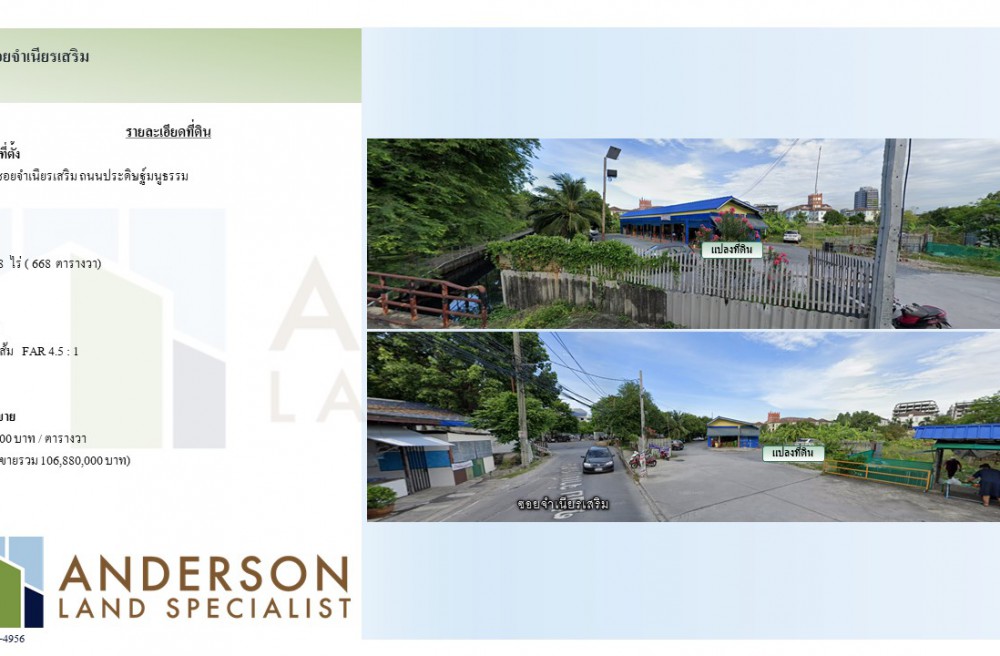 ขายที่ดินซอยจำเนียรเสริม ถนนประดิษฐ์มนูธรรม เนื้อที่ 1-2-68ไร่ (668 ตารางวา)