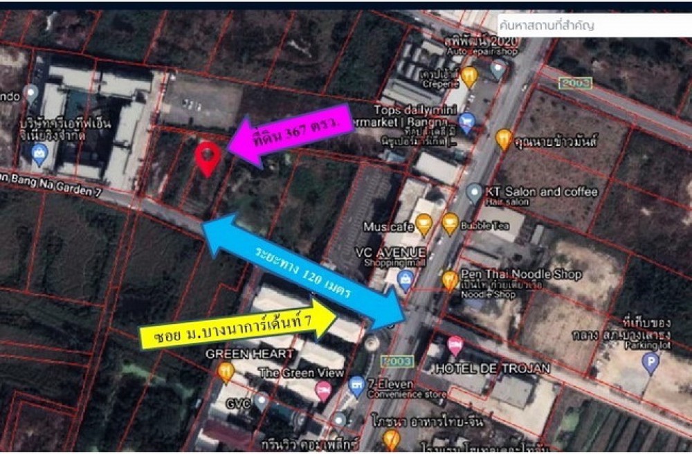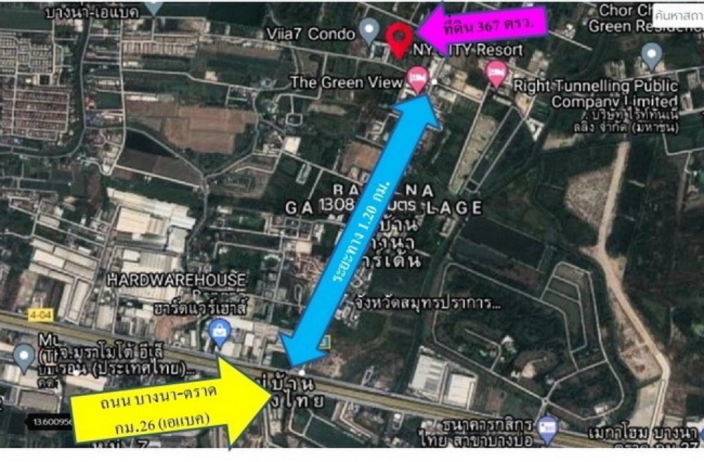 ขายที่ดิน ซอยหมู่บ้านบางนาการ์เด้น7 ถนนบางนา-ตราด กม.26 ตำบลบางเสาธง อำเภอบางเสาธง สมุทรปราการ รายละเอียดทรัพย์ – ที่ดิน เนื้อที่ 367 ตารางวา หน้ากว้าง 25 x 60 เมตร – แปลงที่ดินสี่เหลี่ยมผื่นผ้า ผังเมืองสีส้ม – เหมาะสำหรับสร้างที่พักอาศัย หอพัก คอนโด หรือเพื่อลงทุนในอนาคต – จากปากซอยหมู่บ้านบางนาการ์เด้น 7 มาแปลงที่ดิน 150 เมตร – หน้าที่ดินติดถนนสาธารณประโยชน์(คอนกรีต) กว้าง 8 เมตร – ประปา ไฟฟ้าเข้าถึงที่ดิน – ตารางวาละ 24,523 บาท สถานที่ใกล้เคียง – ม.อัสสัมชัญ(เอแบค) – รพ.บางนา 2 – สำนักงานที่ดินสาขาบางพลี – ที่ว่าการอำเภอบางเสาธง การเดินทาง – ตั้งบน ถ.บางนา-ตราด – เชื่อมต่อ ถ.เทพารักษ์, ถ.เลียบคลองส่งน้ำ – เชื่อมต่อ ถ.ลาดกระบัง, ถ.กิ่งแก้ว – ใกล้ทางด่วนบูรพาวิถี – ใกล้วงแหวนรอบนอก, มอเตอร์เวย์กรุงเทพ-ชลบุรี