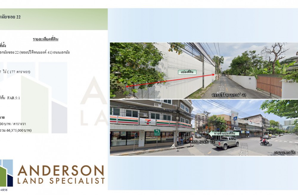 ขายที่ดิน เอกมัยซอย 22 (ซอยปรีดีพนมยงค์ 41) ถนนเอกมัย เนื้อที่ 0-1-77ไร่ (177 ตารางวา)
