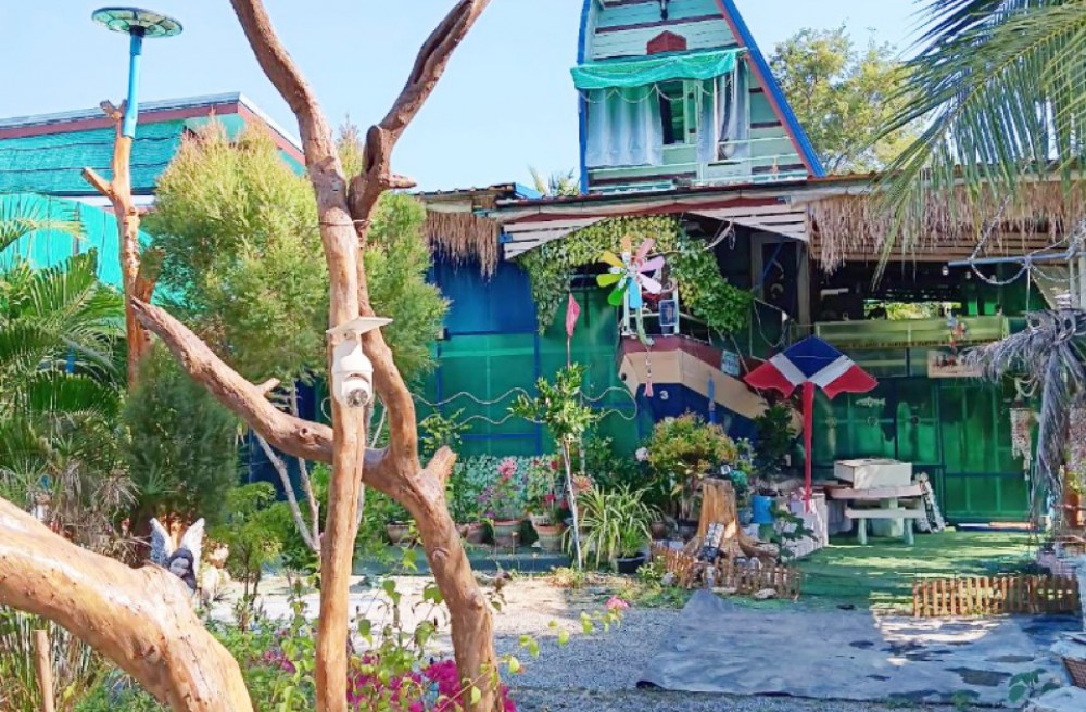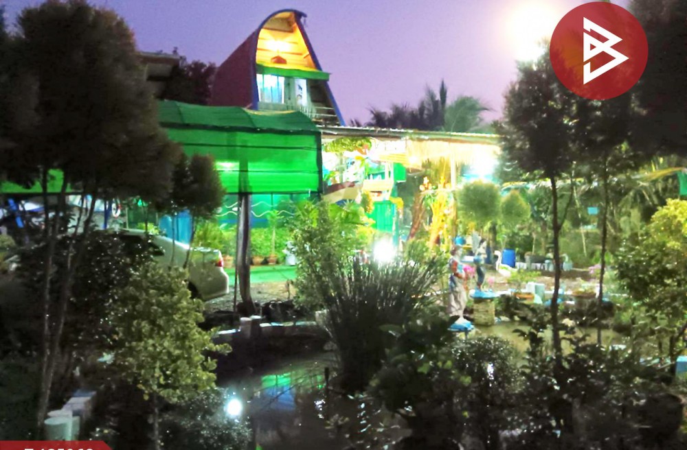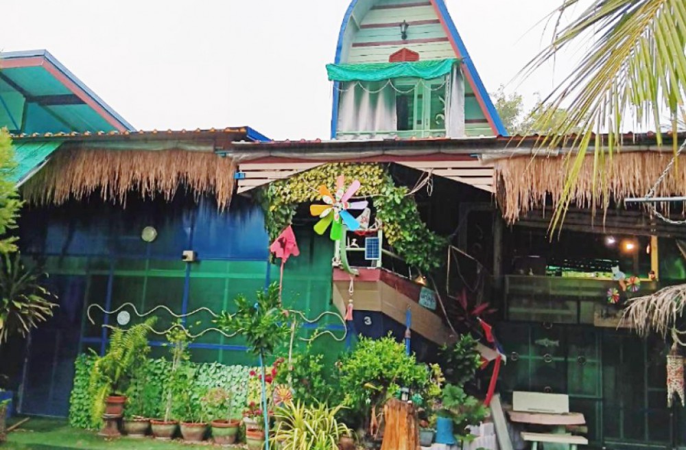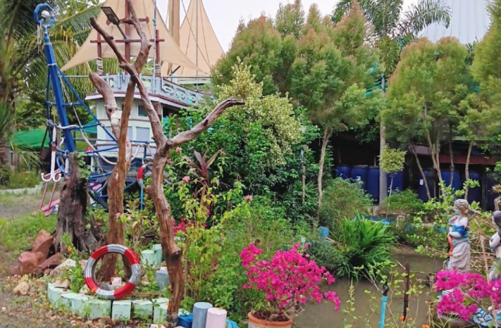 ในบริเวณที่ดินมีบ้าน 2 หลัง ล้อมรอบด้วยคลองส่วนตัว และถนนไม้นานาพันธุ์ ไม่ว่าจะเป็นมะพร้าวน้ำหอม ต้นมะริด น้ำลำพู