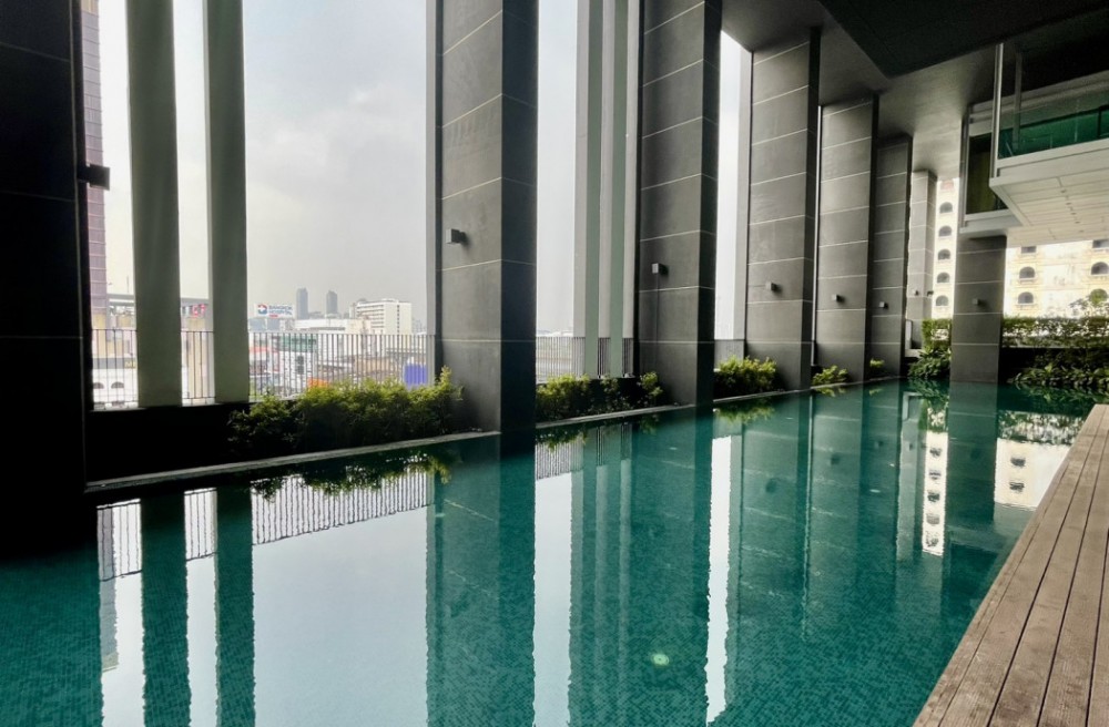 บรรยากาศ: เป็นสระแบบ Infinity Edge Pool ที่ตกแต่งสวนและมีต้นไม้รอบๆ เพื่อความเป็นส่วนตัว