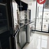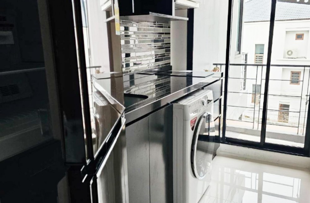 ครัวแยกสัดส่วน: เคาน์เตอร์ครัวสีดำ พร้อมเครื่องซักผ้าและตู้เย็น ติดระเบียง ระบายอากาศดีเยี่ยม ที่สำคัญได้ห้องมุม