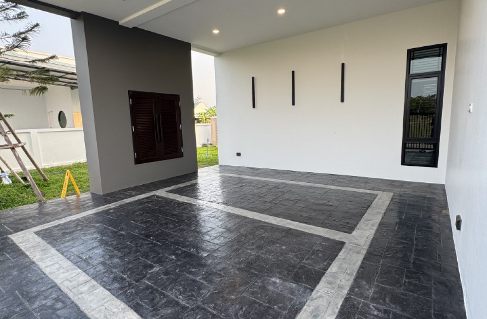 + ปูแสตมป์คอนกรีตเต็มพื้นที่ทั้งโรงจอดรถและลานซักล้าง แข็งแรง ทนทาน และดูสวยเป็นระเบียบ