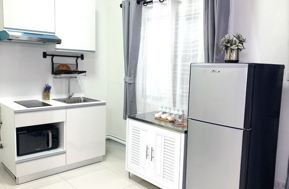 1 โซนครัว Built-in ปูกระเบื้องผนังกันเลอะพร้อมเครื่องดูดควัน เตาไฟฟ้า ซิงค์ล้างจาน
