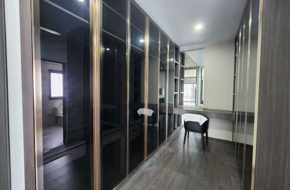 - Master Walkin-Closet : บิ้วอินตู้เสื้อผ้า บานกระจกสีชา ตัดขอบเฟรมสีทอง เพิ่มความหรูหรา พร้อมโต๊ะเครื่องแป้ง Built-in