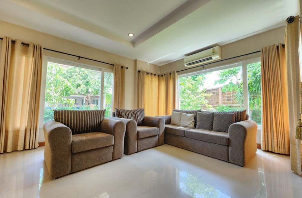 - ตบแต่งผ้าม่านอย่างดีทั้งหลัง พร้อม แอร์ครบทุกห้อง ปั้มน้ำ, แท็งค์น้ำ กระจกบานใหญ่ ทำให้บ้านดูโปร่ง