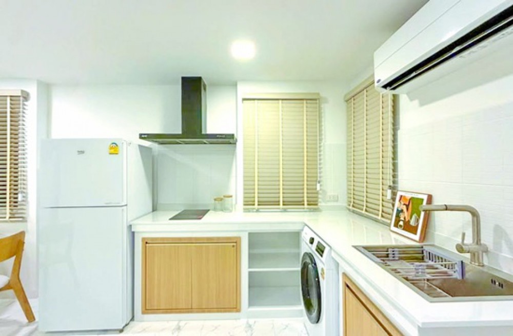 ครัวบิวท์อิน พร้อมเตาไฟฟ้า เครื่องดูดควัน ตู้เย็น และเครื่องซักผ้าอบผ้า