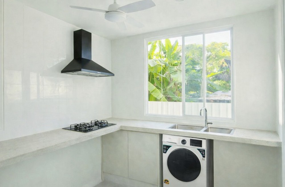 ห้องครัวรับแสงธรรมชาติ อากาศถ่ายเทดี พร้อมฮู้ด และหน้าต่างบานใหญ่