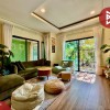 - ระเบียงด้านนอกสำหรับนั่งเล่นนั่งกินกาแฟชมสวน + ต้นไม้และสวน