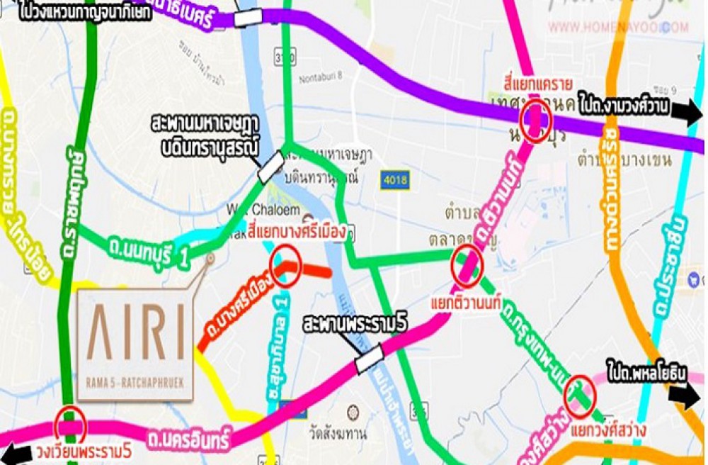 การเดินทาง เริ่มจาก ถนนรัตนาธิเบศร์ → เลี้ยวซ้ายเข้าถนนเลี่ยงเมืองนนท์→ ขึ้นสะพานมหาเจษฎาบดินทรานุสรณ์ (สะพานนนทบุรี 1) เพื่อข้ามมาฝั่งเมืองนนท์ → ตรงมาประมาณ 1.4 กม. จะเจอโครงการ AIRI พระราม 5 – ราชพฤกษ์ อยู่ทางซ้ายมือ