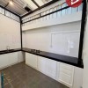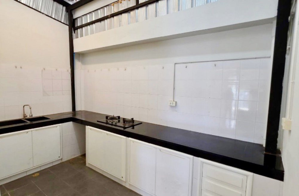 หลังคาครัว สูงโปร่ง ระบายอากาศได้ดี ครัวใหญ่ เคาเตอร์ปูนตัวLยาวสุดผนังพร้อมตู้เก็บของตลอดแนว, เตาแก้สแบบฝังอย่างดี เพดานมีช่องแสงธรรมชาติ